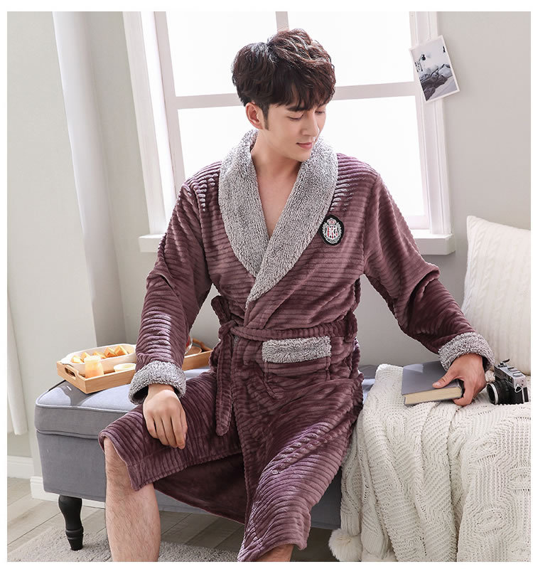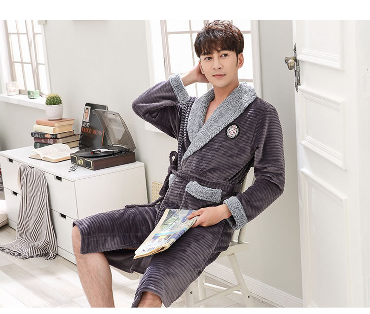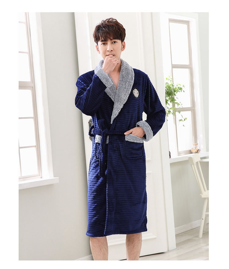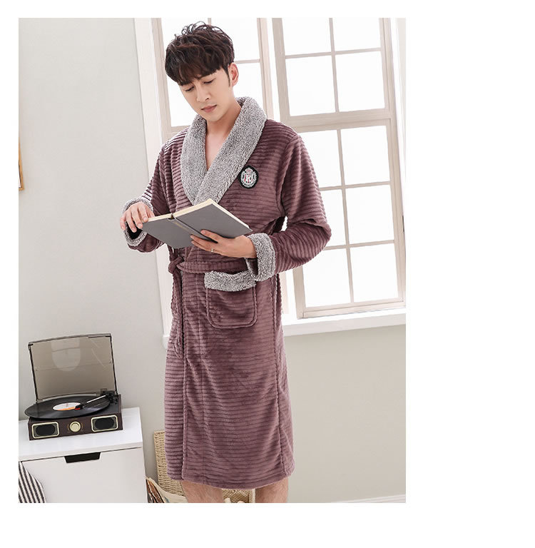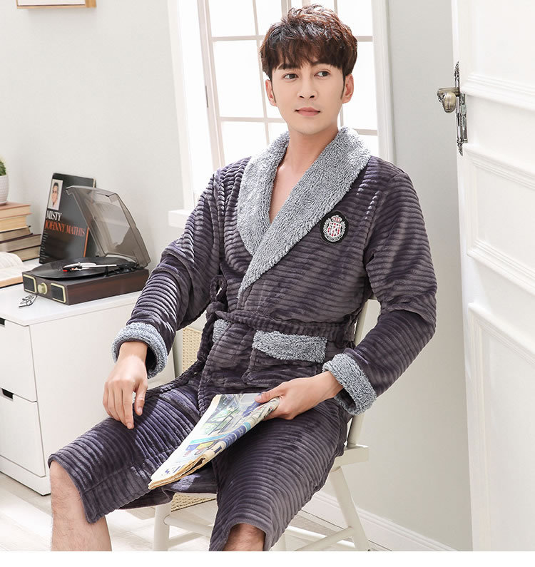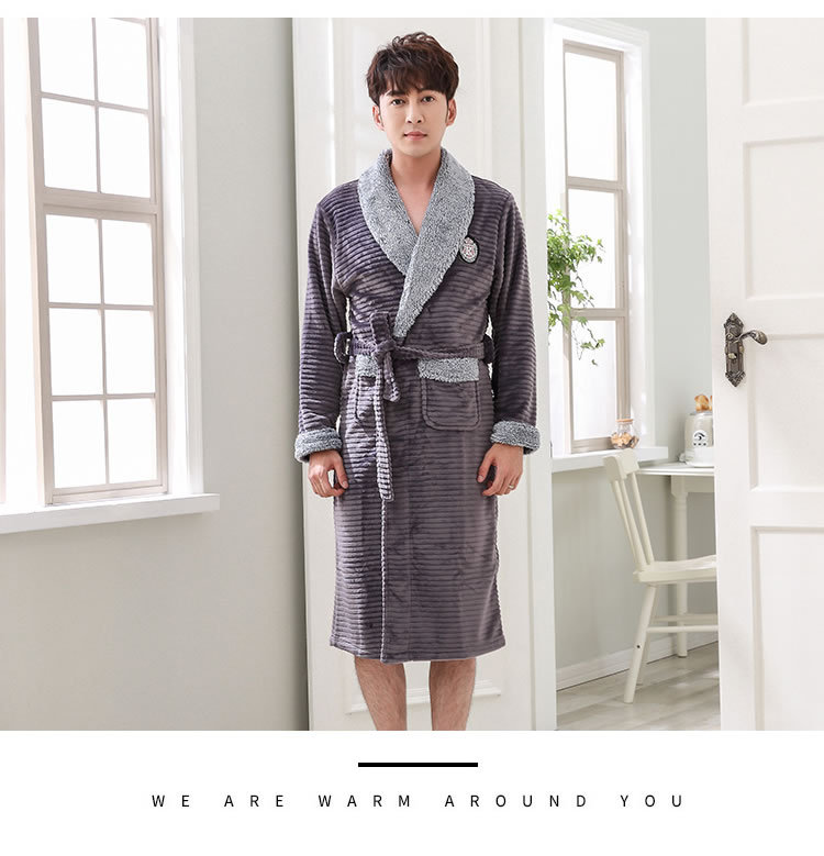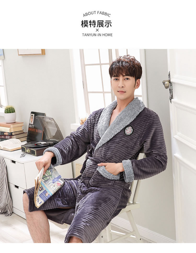 睡袍男冬季珊瑚绒加厚中长款法兰绒浴袍睡衣大码青年浴衣家居服