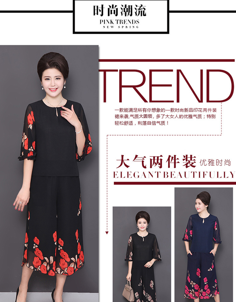 中老年女装 夏季裙套装 韩版大码宽松妈妈装 雪纺套装裙40-50裙子