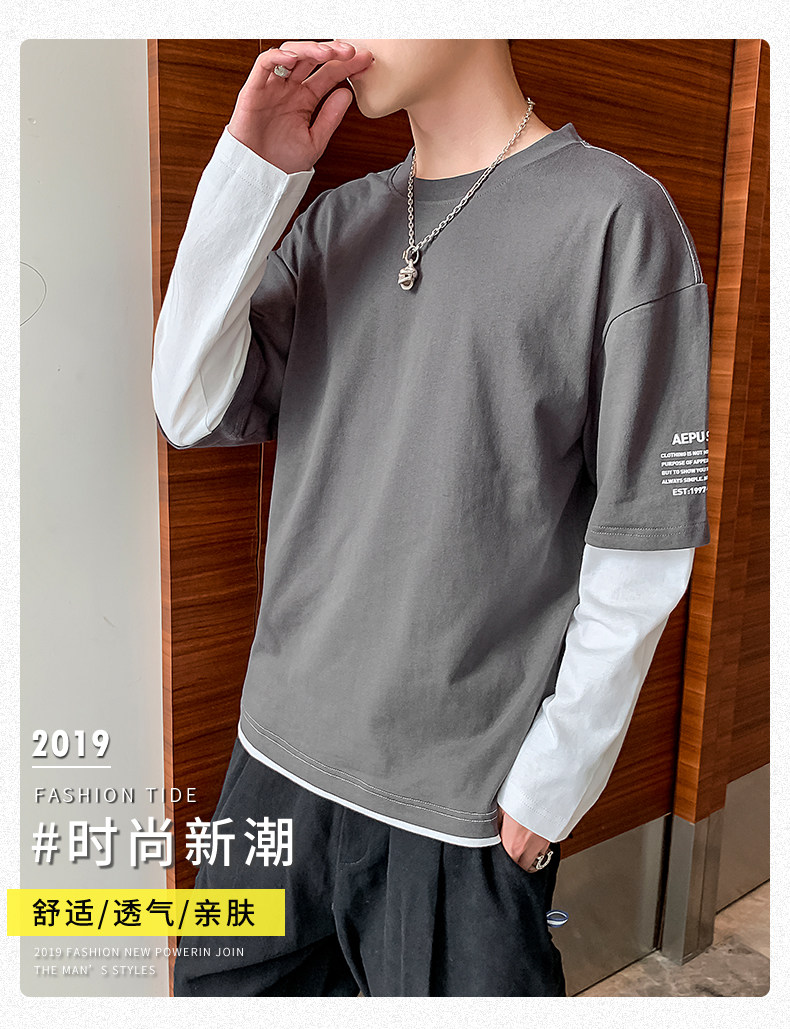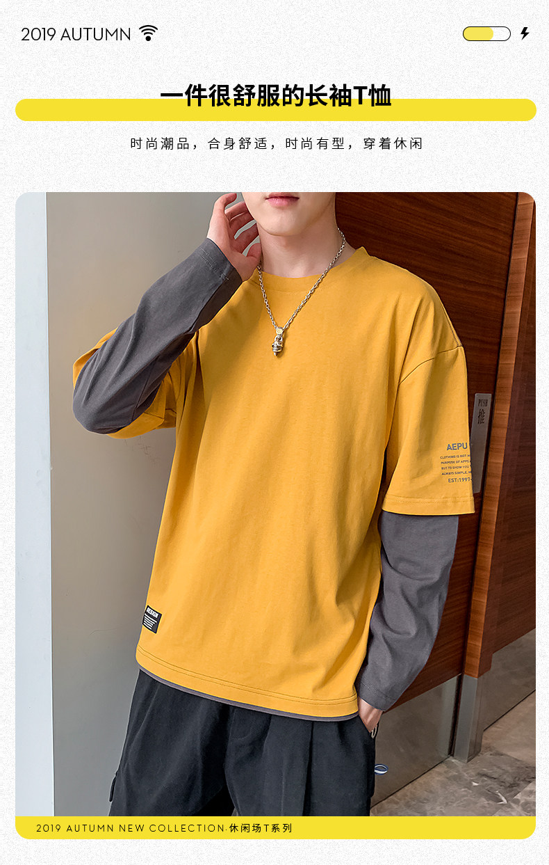 长袖t恤男秋季新款韩版潮流拼接宽松打底衫圆领潮牌休闲卫衣秋装