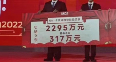 如果有人因为2021年UNI-T销量由盛转衰而替UNI项目组的人担心,那就大可不必了。事实上,尽管经历了虚假宣传和销量直线下滑,但是长安依然在2022年开年为UNI项目组准备了一份大礼:2022年一月,在长安汽车内部召开的2022年一季度高职级人员暨职工代表大会,UNI-T项目团队光荣的获得项目跟投阶段奖励。总奖金为2295万,其中项目总监个人获得317万。