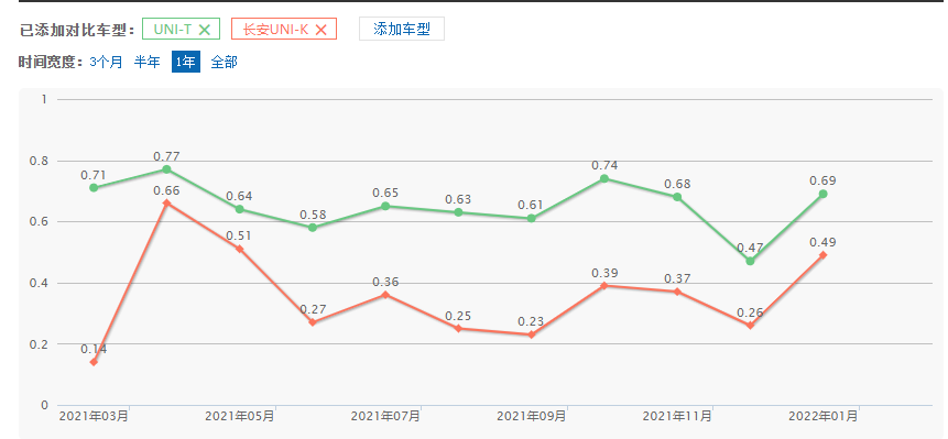 如果说UNI-T是高开低走的话,那么后继者UNI-K在销量方面则只能用惨淡来形容:UNI-K在2021年4月实现月销量6600辆的高点之后就一路回落,每月销售量徘徊在2-3千辆左右。这样的销量对于连续两年总销量突破200万辆的长安汽车而言,显然还不够。