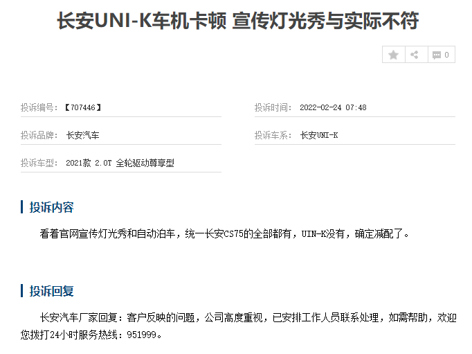 “看着官网宣传灯光秀和自动泊车,统一长安CS75的全部都有,UIN-K没有,确定减配了”、“自动泊车雷达故障无法使用,去到长安指定售后查询得知此问题需拆车换件。”作为近年来国内发展不错的传统车企之一,长安汽车最近有点烦:随着大量车主投诉被曝光,长安UNI-K的虚假宣传、欺诈消费者的问题,成为了汽车行业的热门头条。