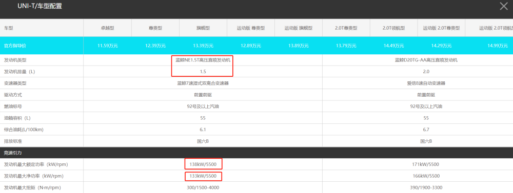 根据长安UNI-T上市时的宣传,其搭载的蓝鲸1.5T高压直喷发动机,在最大功率可以达到138KW,最大净功率也达到133KW,配合300N·m的最大扭矩,整车百公里加速成绩为7.5秒。
